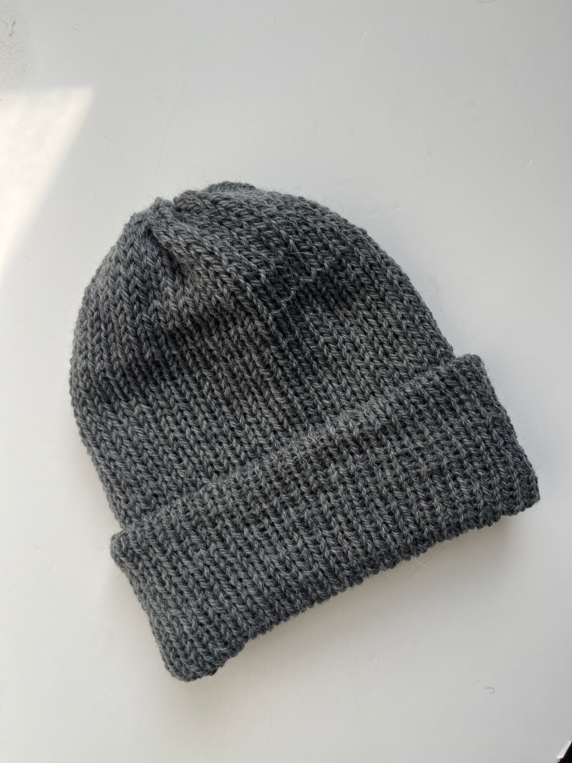 A knitted grey beanie made with 100% wool yarn. Is stretchy and warm.